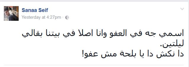 وكانت الناشطة السياسية سناء سيف، قد أفصحت أن اسمها جاء ضمن قائمة العفو، رغم إخلاء سبيلها منذ يومين، مما دعاها للتعليق عبر حسابها على موقع التواصل الاجتماعي “فيس بوك” قائلة: “اسمي جه في العفو وأنا أصلاً في بيتنا بقالي ليلتين، دا نكش دا يا بلحة مش عفو”.
