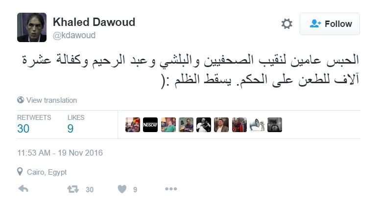 – خالد داوود :الحبس عامين لنقيب الصحفيين والبلشي وعبد الرحيم وكفالة عشرة آلاف للطعن على الحكم.. يسقط الظلم .