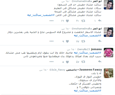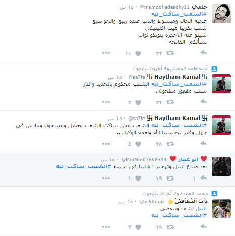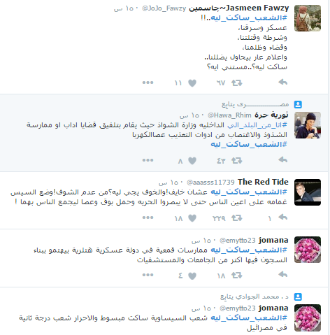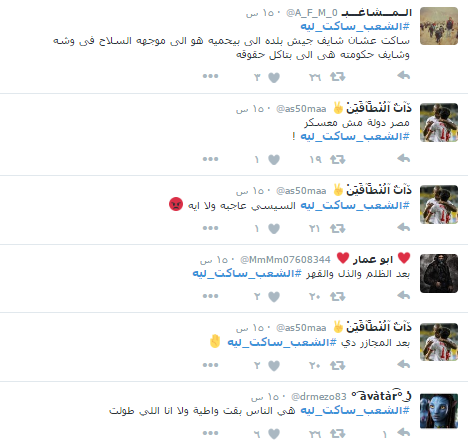 وكتب الرواد عبر الهاشتاج بعض الشعارات التي تعبر عن حجم الظلم الواقع عليهم مثل “مصر دولة مش معسكر ، الشعب ساكت ليه السيسي عاجبه ولا ايه”.