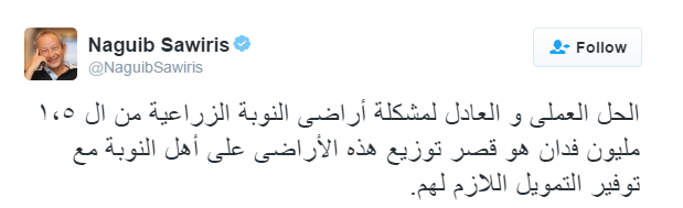 قال ساويرس عبر”تويتر” :” الحل العملي والعادل لمشكلة أراضي النوبة الزراعية من الـ ١.٥ مليون فدان هو قصر توزيع هذه الأراضي على أهل النوبة مع توفير التمويل اللازم لهم”.