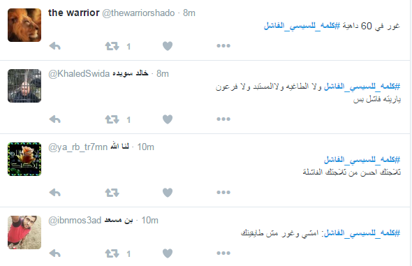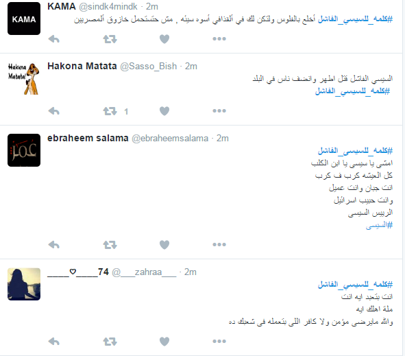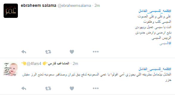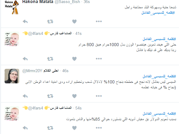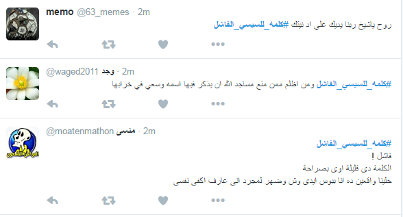 تصدر وسم ” كلمة للسيسي الفاشل” موقع تويتر، حيث جاءت بعض التعليقات المنددة بتدهور أوضاع مصر في عهد السيسي على النحو التالي:
