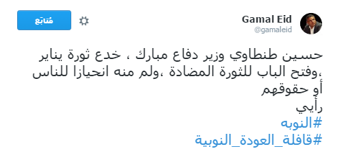 ورأى الحقوقي جمال عيد، أن “حسين طنطاوي وزير دفاع مبارك، خدع ثورة يناير، وفتح الباب للثورة المضادة، ولم -نرى- منه انحيازا للناس أو حقوقهم”، وذلك في تغريده له على حسابه بـ “تويتر”.