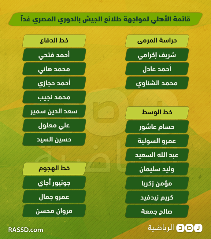استقر حسام البدري المدير الفني لفريق الأهلي، على قائمة فريقه التي تخوض مواجهة الجيش، غدًا الأربعاء، ضمن الجولة العاشرة في الدوري الممتاز.