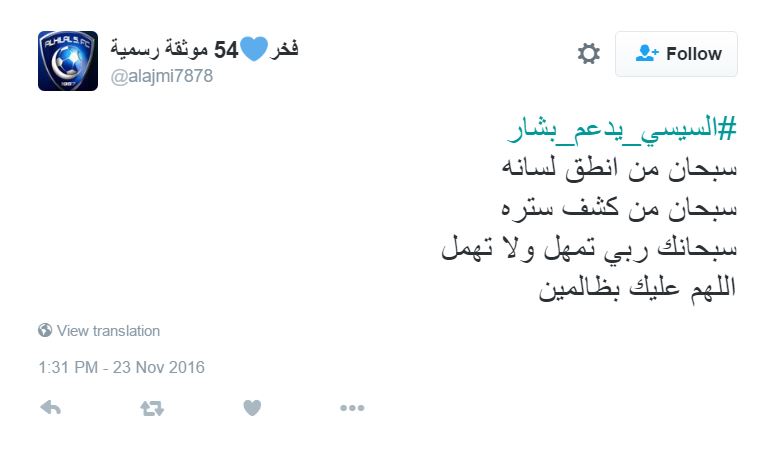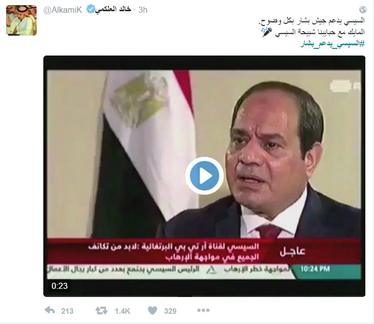 وقال الكاتب السعودي خالد العلكمي في تدوينة على صفحته الشخصية “السيسي يدعم جيش بشار بكل وضوح.. الماسك مع حبايبنا شبيحة السيسي”.