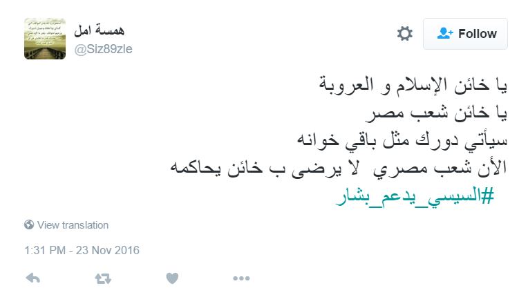 ودشن النشطاء على موقع التدوينات الصغيرة تويتر، هاشتاج باسم “السيسي يدعم بشار”، أعلنوا من خلاله رفضهم المشاركة في قتل السوريين عن طريق دعم عبد الفتاح السيسي.
