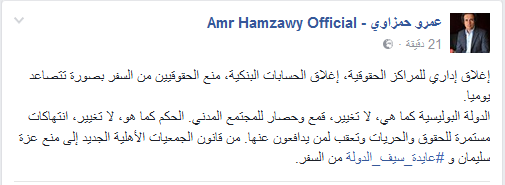 وقال حمزاوي في منشور على صفحته الشخصية “فيس بوك”: “إغلاق إداري للمراكز الحقوقية، إغلاق الحسابات البنكية، منع الحقوقيين من السفر بصورة تتصاعد يوميا”.