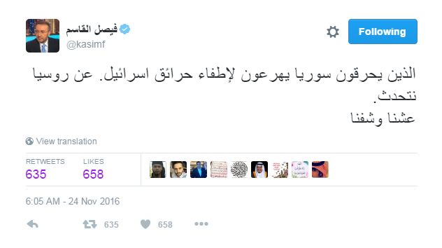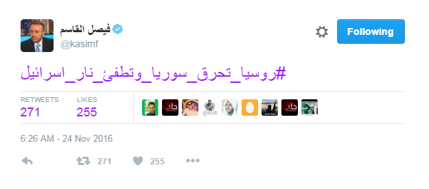 وقال القاسم في تدوينة له عبر موقع التواصل الاجتماعى “تويتر”: “روسيا تحرق سوريا وتطفئ نار إسرائيل”.
