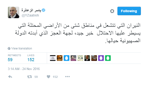 وقال الزعاترة في تدوينه له على موقع التدوين العالمي “تويتر”: “النيران التي تتشعل في مناطق شتى من الأراضي المحتلة التي يسيطر عليها الاحتلال خبر جيد، لجهة العجز الذي أبدته الدولة الصهيونية حيالها”.