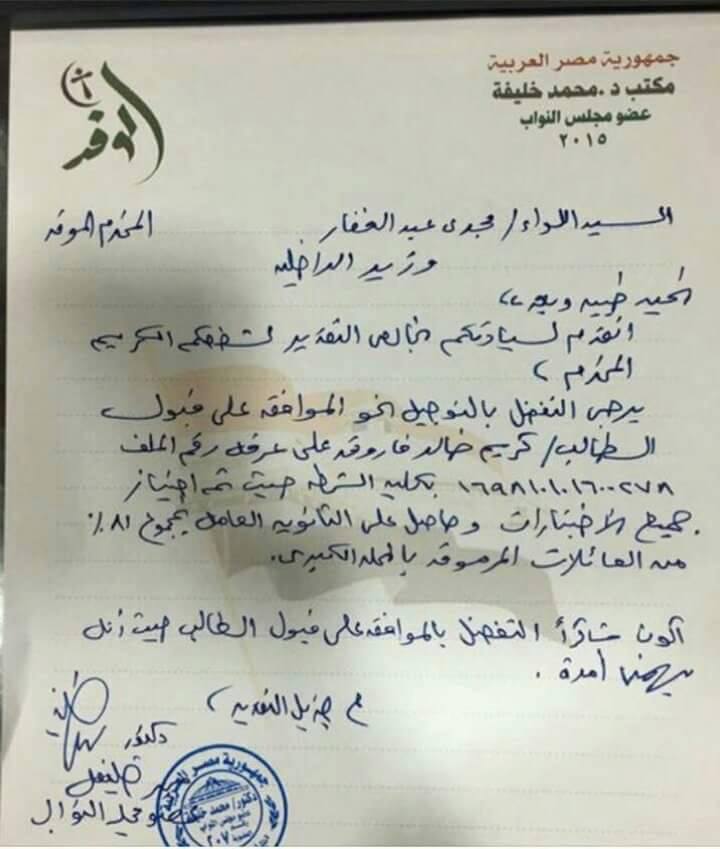 يذكر أن محمد خليفة، عضو مجلس النواب عن دائرة بندر المحلة في محافظة الغربية، قد نشر علي حسابه بموقع التواصل الاجتماعي “فيسبوك” أمس، طلبًا تقدم به إلى وزير الداخلية، مجدي عبد الغفار، لقبول أحد طلاب الثانوية العامة بكلية الشرطة.