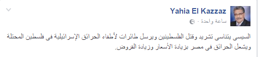 وتابع :” السيسى يتناسى تشريد وقتل الفلسطينين ويرسل طائرات لآطفاء الحرائق الإسرائيلية فى فلسطين المحتلة ويشعل الحرائق فى مصر بزيادة الأسعار وزيادة القروض”