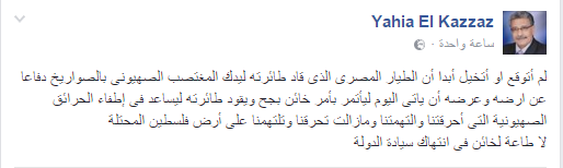 واستطرد :” لم أتوقع او أتخيل أبدا أن الطيار المصرى الذى قاد طائرته ليدك المغتصب الصهيونى بالصواريخ دفاعا عن ارضه وعرضه أن ياتى اليوم ليأتمر بأمر خائن بجح ويقود طائرته ليساعد فى إطفاء الحرائق الصهيونية التى أحرقتنا والتهمتنا ومازالت تحرقنا وتلتهمنا على أرض فلسطين المحتلة، لا طاعة لخائن فى انتهاك سيادة الدولة”