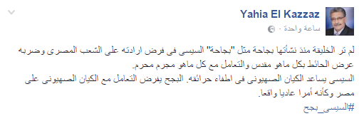 و أضاف خلال عدة منشورات علي صفحته الشخصية “فيس بوك” :” لم تر الخليقة منذ نشأتها بجاحة مثل “بجاحة” السيسى فى فرض ارادته على الشعب المصرى وضربه عرض الحائط بكل ماهو مقدس والتعامل مع كل ماهو مجرم محرم .. السيسى يساعد الكيان الصهيونى فى اطفاء حرائقه.. البجح يفرض التعامل مع الكيان الصهيونى على مصر وكأنه أمرا عاديا واقعا.”