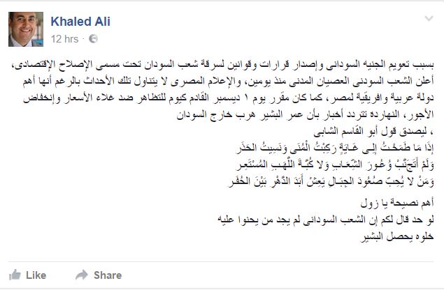 انتقد المرشح الرئاسي السابق، المحامي خالد علي، تجاهل الإعلام المصري للعصيان المدني في السودان، رغم أهمية دولة كالسودان عربياً وأفريقيا لمصر.