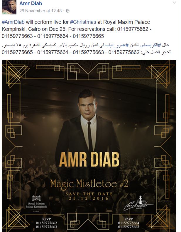 حالة من الغضب سادت بين جمهور المطرب عمرو دياب، بعد الشروط التي وضعتها الشركة المنظمة لحفله، والذي من المقرر أن يقام في فندق رويال مكسيم بالاس كمبنسكي القاهرة يوم ٢٥ ديسمبر.