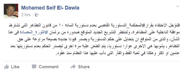 وأضاف سيف الدولة عبر منشور على صفحته الشخصية على موقع “فيس بوك”: أنه “من المتوقع ان يتحايل على حكم الدستورية ويصدر قيودا جديدة بصيغة مراوغة على حق التظاهر، يشوبها هى الاخرى عوارا دستوريا، يتم الطعن عليه مرة اخرى ليصدر الحكم بعدم دستوريتها بعد عامين او اكثر وهكذا فى لعبة القط والفأر التى دأب عليها هذا النظام منذ عقود”.