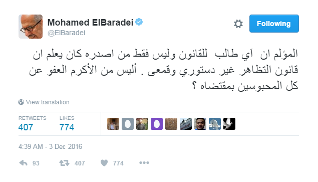 وقال البرادعي في تدوينة له عبر صفحته الشخصية على موقع التدوين العالمي “تويتر”: “المؤلم أن أي طالب للقانون وليس فقط من أصدره كان يعلم أن قانون التظاهر غير دستوري وقمعي، أليس من الأكرم العفو عن كل المحبوسين بمقتضاه ؟”.