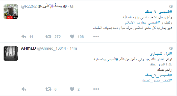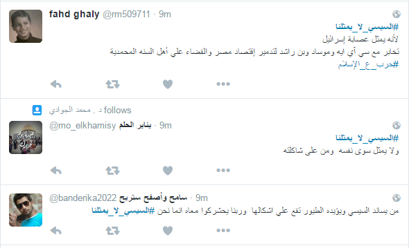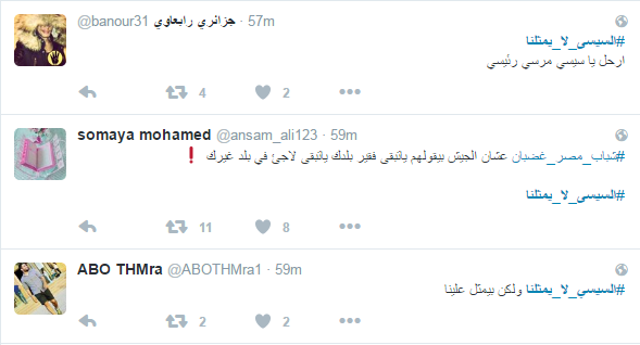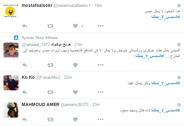 وحصل هاشتاج “#السيسي_لا_يمثلنا” على تريند داخل مصر .. وجاءت التغريدات كالتالي: