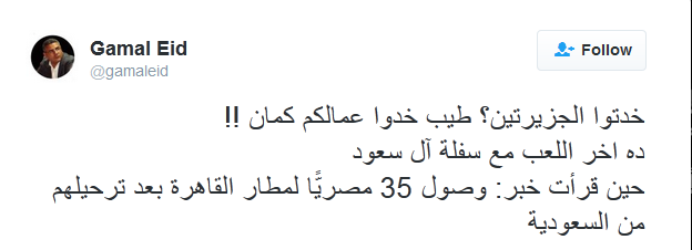 وعلق الحقوقي جمال عيد على ترحيل المصريين من السعودية:” ده آخر اللعب مع سفلة آل سعود”.