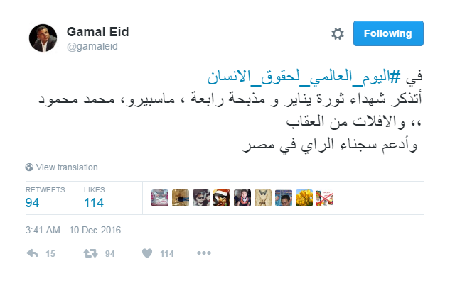 وكتب عيد في تدوينة له عبر موقع التواصل العالمى “تويتر”: “في اليوم العالمي لحقوق الإنسان، أتذكر شهداء ثورة يناير ومذبحة رابعة، ماسبيرو، محمد محمود، والإفلات من العقاب، وأدعم سجناء الرأي في مصر”.