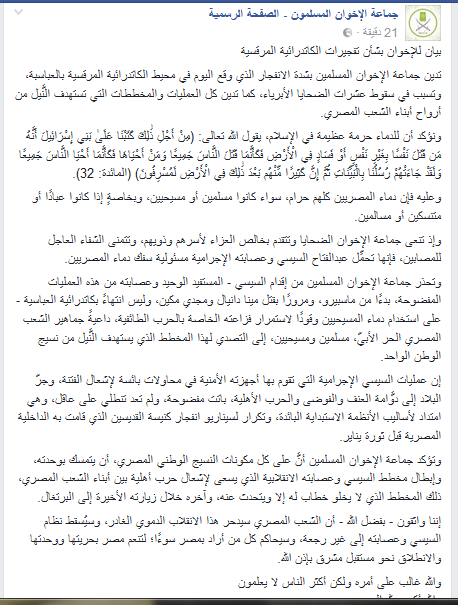 قالت الجماعة في بيان عبر صفحتها علي “فيس بوك”:” تدين جماعة الإخوان المسلمين بشدة الانفجار الذي وقع اليوم في محيط الكاتدرائية المرقسية بالعباسبة، وتسبب في سقوط عشرات الضحايا الأبرياء، كما تدين كل العمليات والمخططات التي تستهدف النَّيل من أرواح أبناء الشعب المصري، ونؤكد أن للدماء حرمة عظيمة في الإسلام، يقول الله تعالى: (مِنْ أَجْلِ ذَٰلِكَ كَتَبْنَا عَلَىٰ بَنِي إِسْرَائِيلَ أَنَّهُ مَن قَتَلَ نَفْسًا بِغَيْرِ نَفْسٍ أَوْ فَسَادٍ فِي الْأَرْضِ فَكَأَنَّمَا قَتَلَ النَّاسَ جَمِيعًا وَمَنْ أَحْيَاهَا فَكَأَنَّمَا أَحْيَا النَّاسَ جَمِيعًا وَلَقَدْ جَاءَتْهُمْ رُسُلُنَا بِالْبَيِّنَاتِ ثُمَّ إِنَّ كَثِيرًا مِّنْهُم بَعْدَ ذَٰلِكَ فِي الْأَرْضِ لَمُسْرِفُونَ) (المائدة: 32)، وعليه فإن دماء المصريين كلهم حرام، سواء كانوا مسلمين أو مسيحيين، وبخاصةٍ إذا كانوا عبادًا أو متنسكين أو مسالمين”