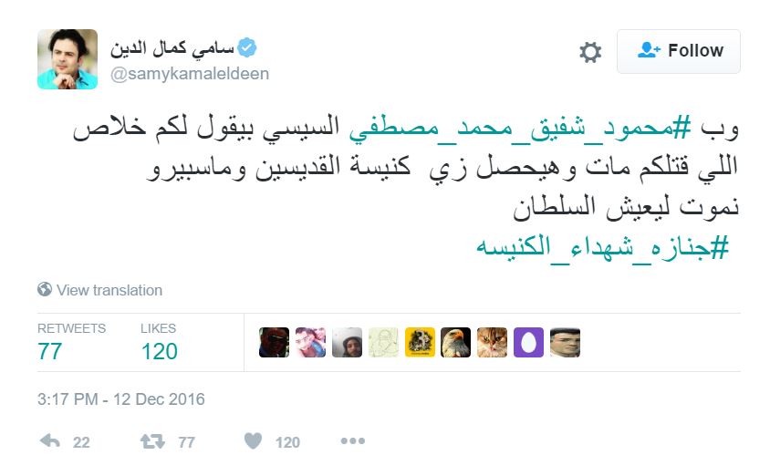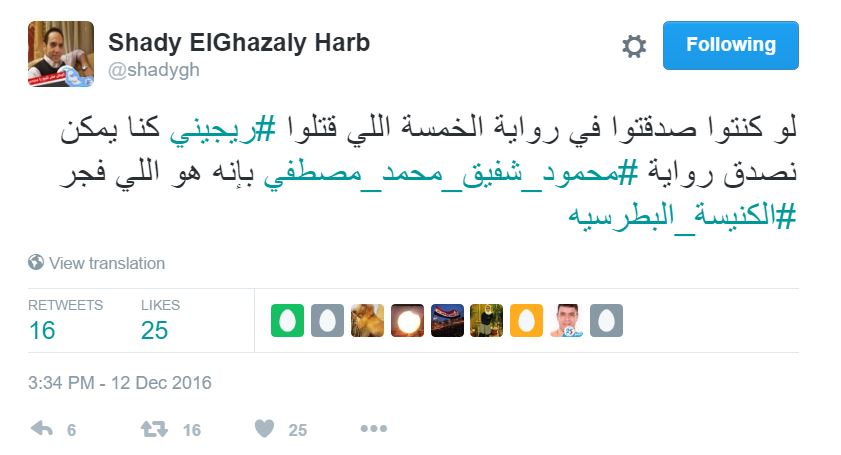 وقال شادي الغزالي حرب في تغريدة له، “لو كنتوا صدقتوا في رواية الخمسة اللي قتلوا #ريجيني كنا يمكن نصدق رواية #محمود_شفيق_محمد_مصطفى، بأنه هو اللي فجر #الكنيسة_البطرسيه”.