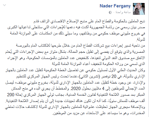 وقال فرجاني عبر صفحته الضخصية “فيس بوك”:” صدر بيان رسمي من رئاسة الجمهورية أكدت فيه دعمها للإجراءات التي ستتجلى تداعياتها الكبرى في خروج مليوني موظف حكومي من وظائفهم، وما سيلي ذلك من انعكاسات على الموازنة العامة للدولة.”