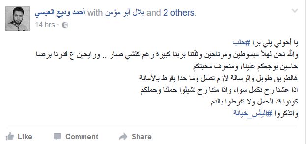 وبعث بلال رسالة إلى الامة الإسلامية قال فيها، “لقد أضعتم الفرصة، خاصة وإن الجيش التركي يبعد 25 كم فقط عن مدينة حلب، وكذلك السعوديين قد أضاعوا تلك الفرصة”.