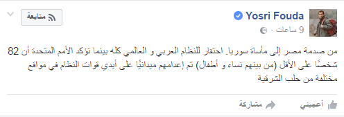 وكتب فودة في منشور عبر صفحته الشخصية بموقع التواصل الاجتماعي “فيس بوك”: “من صدمة مصر إلى مأساة سوريا.. احتقار للنظام العربي والعالمي كله، بينما تؤكد الأمم المتحدة أن 82 شخصًا على الأقل (من بينهم نساء و أطفال) تم إعدامهم ميدانيًا على أيدي قوات النظام في مواقع مختلفة من حلب الشرقية”.