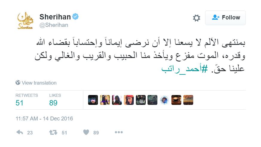 وقالت الفنانة شريهان عبر حسابها الشخصي على موقع تويتر، “بمنتهى الألم لا يسعنا إلا أن نرضى إيماناً وإحتساباً بقضاء الله وقدره، الموت مفزع ويأخذ منا الحبيب والقريب والغالي ولكن علينا حقّ”.