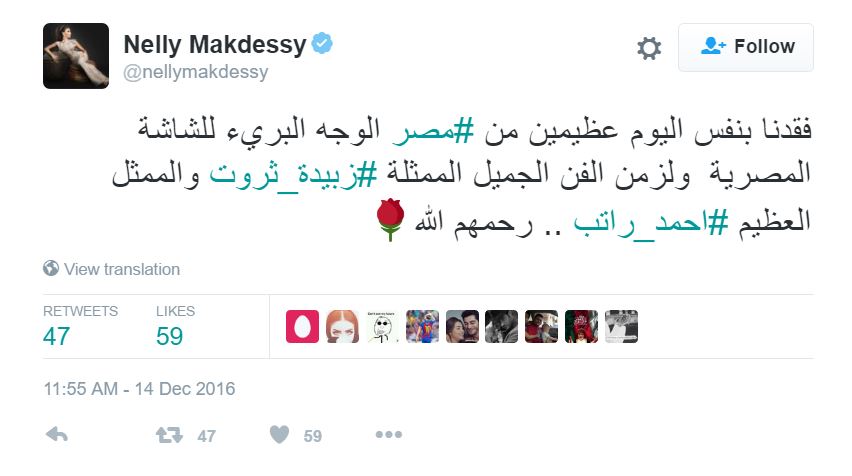 ونعت الفنانة نيللي مقدسي، الفنانين أحمد راتب وزبيدة ثروت، قائلة “فقدنا بنفس اليوم عظيمين من #مصر الوجه البريء للشاشة المصرية ولزمن الفن الجميل الممثلة #زبيدة_ثروت والممثل العظيم #احمد_راتب .. رحمهم الله”.