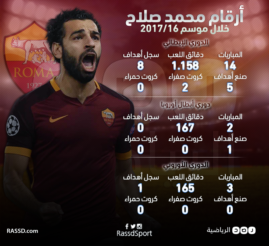 شهد أداء محمد صلاح هذا الموسم مع فريقه روما في الدوري الإيطالي مشاركة متميزة، إلا أن تعرضه لإصابة في الكاحل بسبب تدخل قوي من زميله البلجيكي توماس فيرمايلين أثرت بشكل كبير بعدما غاب عن الملاعب 3 أسابيع كاملة، ويأمل فريق روما أن يشارك مع فريقه في المباراة الهامة والقادمة أمام يوفنتوس.