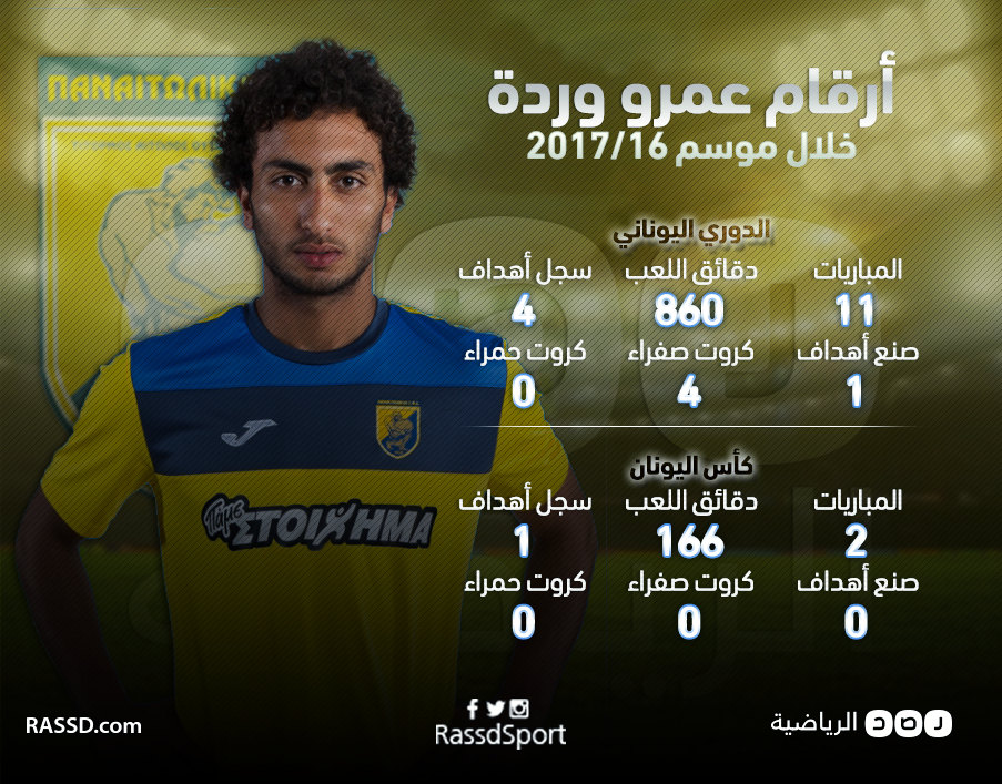 شاهد إحصائية عمرو وردة لاعب نادي بانيتوليكوس اليوناني في 2016.