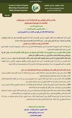 وتؤكد كتائب القسام على أن عملية اغتيال القائد الشهيد محمد الزواري في تونس هي اعتداء على المقاومة الفلسطينية وكتائب القسام، وعلى العدو أن يعلم بأن دماء القائد الزواري لن تذهب هدرًا ولن تضيع سدى.
