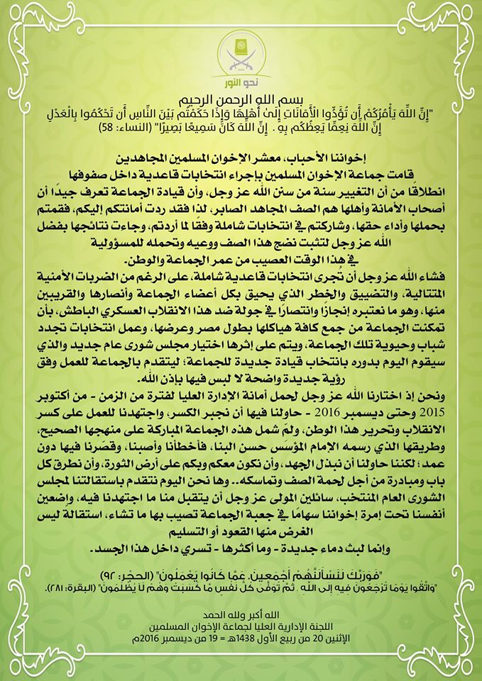 واختتمت اللجنة بيانها قائلة :”نحن إذ اختارنا الله عز وجل لحمل أمانة الإدارة العليا لفترة من الزمن – من أكتوبر 2015 وحتى ديسمبر 2016 – حاولنا فيها أن نجبر الكسر، واجتهدنا للعمل على كسر الانقلاب وتحرير هذا الوطن، ولمِّ شمل هذه الجماعة المباركة على منهجها الصحيح، وطريقها الذي رسمه الإمام المؤسس حسن البنا، فأخطأنا وأصبنا، وقصّرنا فيها دون عمد؛ لكننا حاولنا أن نبذل الجهد، وأن نكون معكم وبكم على أرض الثورة، وأن نطرق كل باب ومبادرة من أجل لحمة الصف وتماسكه.. وها نحن اليوم نتقدم باستقالتنا لمجلس الشورى العام المنتخب، سائلين المولى عز وجل أن يتقبل منا ما اجتهدنا فيه، واضعين أنفسنا تحت إمرة إخواننا سهامًا في جعبة الجماعة تصيب بها ما تشاء، استقالةً ليس الغرض منها القعود أو التسليم، وإنما لبث دماء جديدة – وما أكثرها – تسري داخل هذا الجسد”.