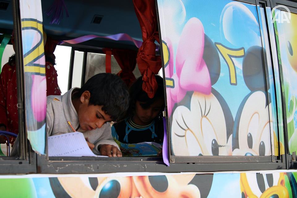 “أيام عزيزة”، وهو مدرس من الكادر المخصّص لإحدى حافلات التعليم المتنقل في ريف درعا الشرقي، قال لوكالة الأناضول إن “منظمة غصن زيتون، المختصة في الشؤون الإنسانية والتعليمية في درعا والقنيطرة (غير حكومية)، عملت على إتمام مشروع باص (حافلة) التعليم المتنقل عبر تجهيز أربع باصات، وتخصيص سائق ومدرّسين اثنين لكل واحد، لزيارة مخيمات النازحين، التي تفتقر للمدارس، بهدف تعليم الأطفال داخل الباص، وخاصةً من لم يتسنّى لهم دخول المدرسة أبدًا”.