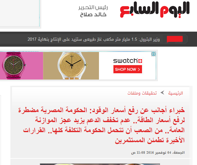 فيما بررت صحيفة اليوم السابع قرار رفع أسعار الوقود في نوفمبر الماضي، حيث نشرت تقرير بعنوان “خبراء أجانب عن رفع أسعار الوقود: الحكومة المصرية مضطرة لرفع أسعار الطاقة”.