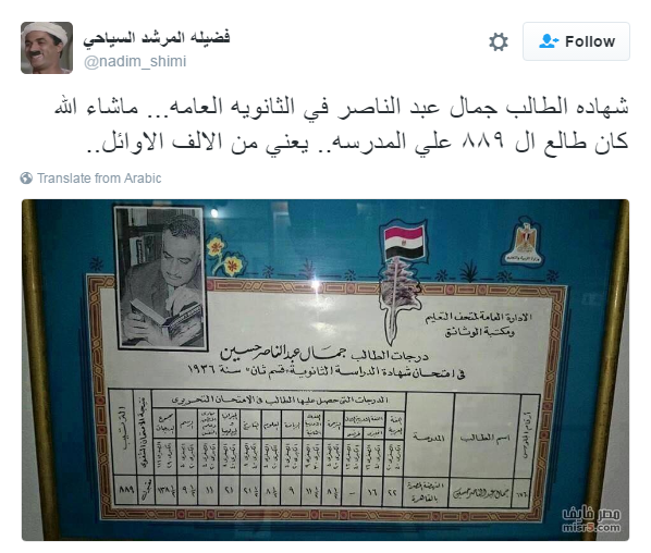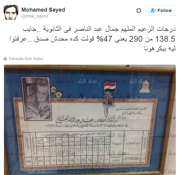حالة من الجدل شهدتها مواقع التواصل الاجتماعي حول شهادة الرئيس الراحل جمال عبد الناصر في الثانوية العامة والتي كشفت تدني الدرجات في المواد التي كان يدرسها، حيث حصل على 49% .