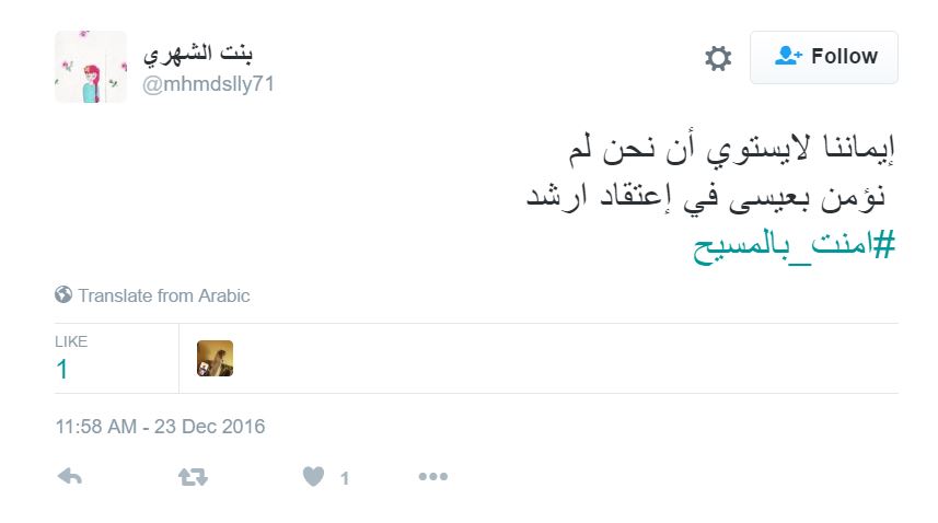 واطلق النشطاء هاشتاج ” I_Believe_in_Jesus#”، لنشر القصيدة مترجمة إلى اللغة الإنجليزية، والمشاركة في ردود الفعل، بالإضافة إلى الهاشتاج “آمنت_بالمسيح”.