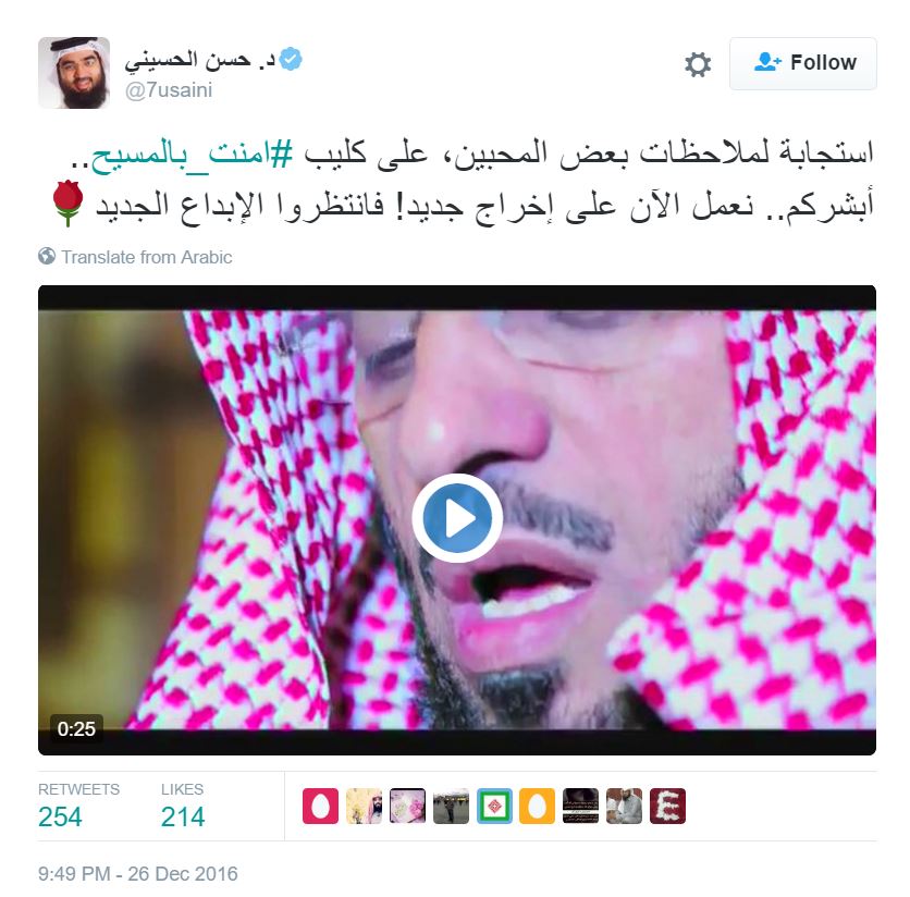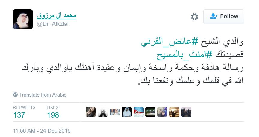أثارالداعية الإسلامي، الدكتور عائض القرني، الجدل بعد نشر قصيدة من كلماته بعنوان “آمنت بالمسيح”،عبر فيديو كليب، حيث تزامن اصدارها مع أعياد الميلاد التي يحتفل بها مسيحيو العالم في هذا التوقيت من العام.