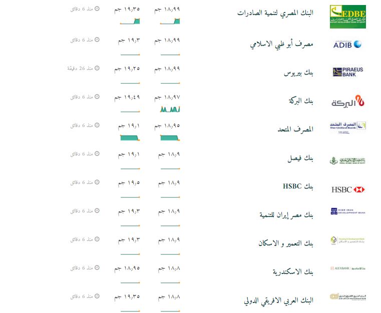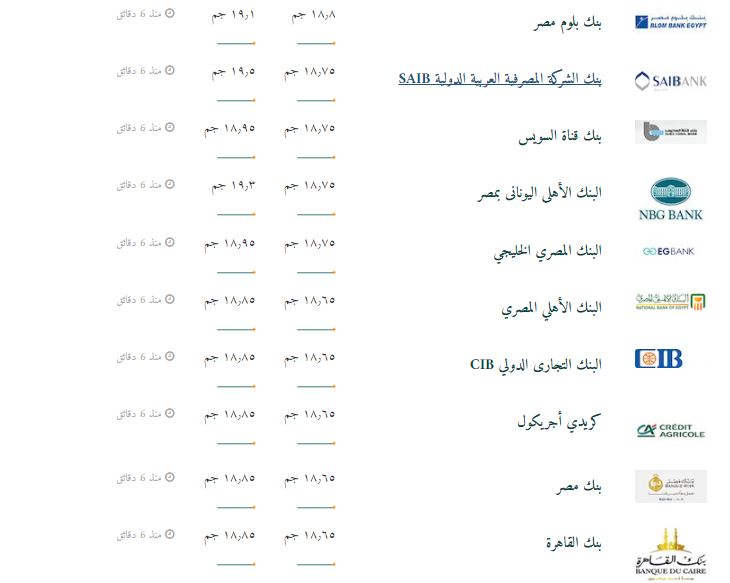 شهد سعر صرف الدولار أمام الجنيه في التعاملات الصباحية ارتفاعًا طفيفًا فوق حاجز الـ19 جنيهًا. وسجل في بنك بيريوس 18,99 جنيهًا للشراء 19,25 جنيهًا للبيع، بنك فيصل 18,9 جنيهًا للشراء 19,1 جنيهًا للبيع، البنك المصري الخليجي 18,75 جنيهًا للشراء، 18,95 جنيهًا للبيع، بنك كريدي أجريكول مصر سعر 18,65 جنيهًا للشراء، 18,85 جنيهًا للبيع، بنك مصر إيران للتنمية 18,9 جنيهًا للشراء، 19,3 جنيهًا للبيع .
