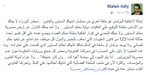 واضاف :”لا يوجد برلمان أو سلطة في العالم تملك انتهاك أحكام الدستور الذي أقسمت علي احترامه، وما هذه الخطوة إلا دليل علي انتصارنا في معركتنا القانونية ودحض كل حجج وروايات الحكومة حول عدم مصرية الجزيرتين .. لذا يتم اللجوء إلي السياسة ..هوا كده .. وان كان عاجبك”