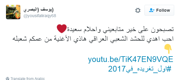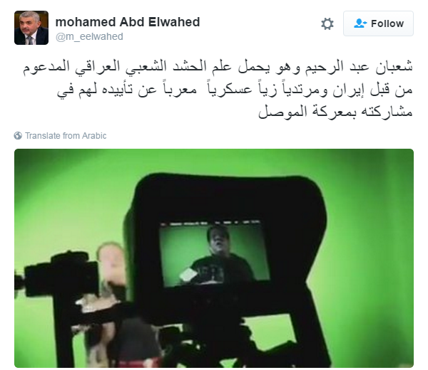 وظهر عبد الرحيم في الفيديو وهو يحمل علم “الحشد الشعبي”:” لو شفت إرهابي خطير هجبله الحشد الشعبي..اسأل عن الحشد الشعبي على طول هتحبهم جدعان يحموا بلدهم ويصونوا عرضهم”.