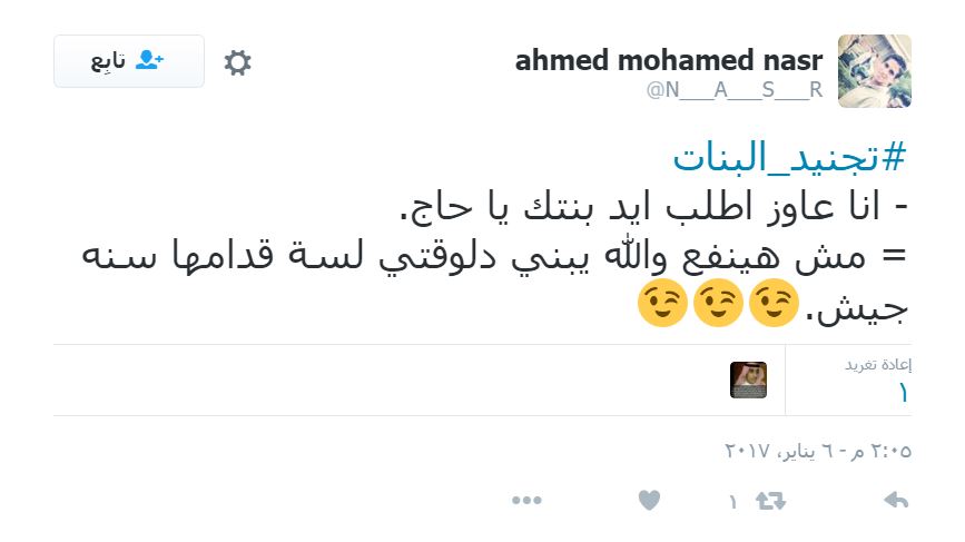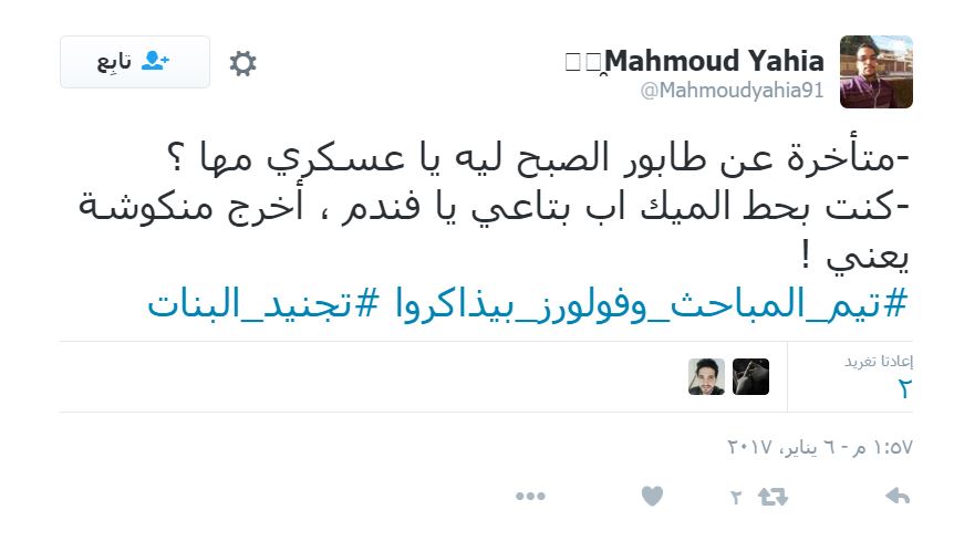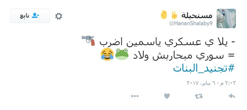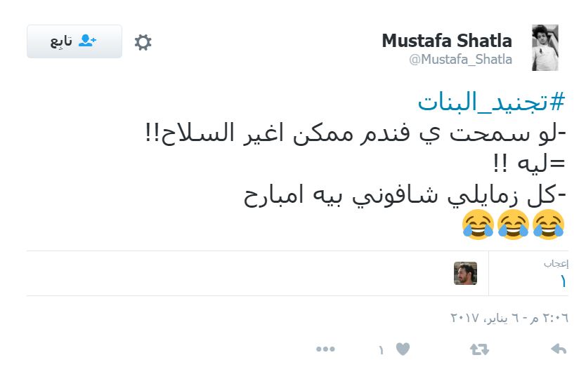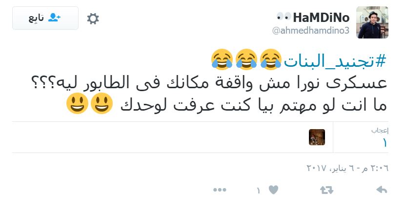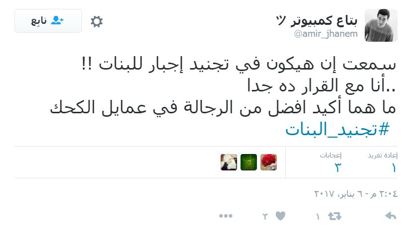ودشن رواد مواقع التواصل الاجتماعي، هاشتاج بعنوان “تجنيد البنات”، مستنكرين القرار ، ووضعوا قصصًا تخيلية لمواقف لفتيات داخل التجنيد.
