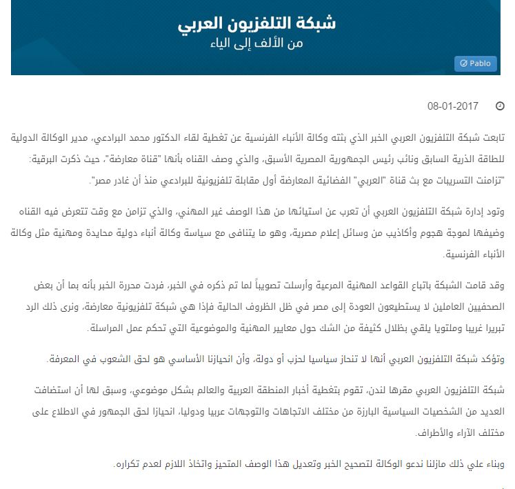 واستكمل البيان، ” أن شبكة التلفزيون العربي أنها لا تنحاز سياسيا لحزب أو دولة، وأن انحيازها الأساسي هو لحق الشعوب في المعرفة”.
