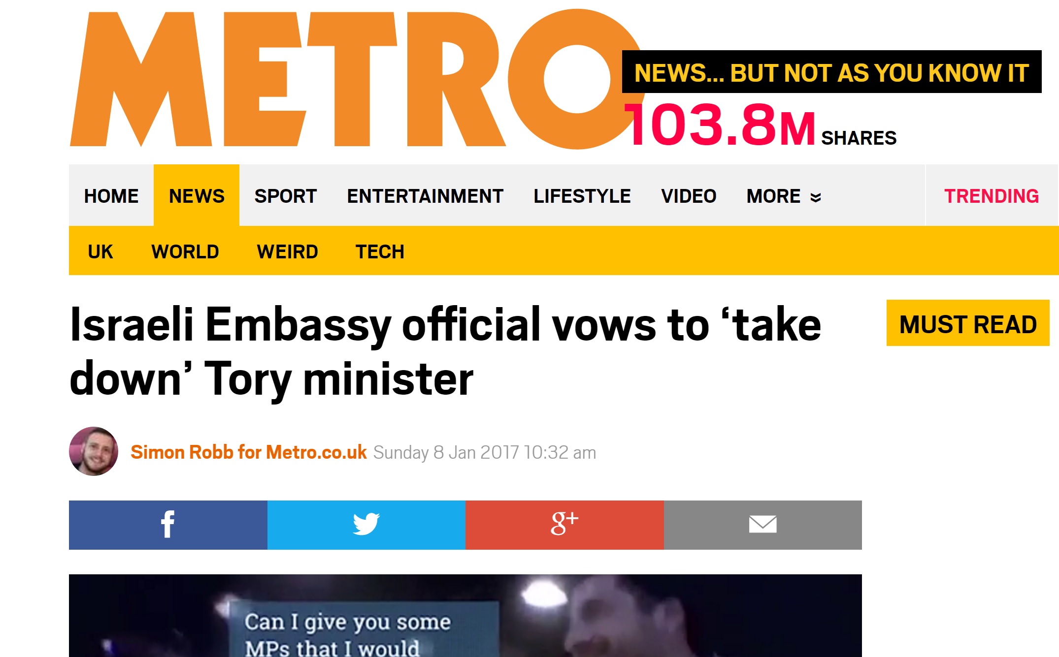 ونشرت جريدة “اندبندنت” التي تحولت الى صحيفة الكترونية تسجيل الفيديو على موقعها الالكتروني، وعنونت للفضيحة بالقول: “مسؤول في السفارة الاسرائيلية تم تصويره وهو يناقش كيفية إسقاط السير آلان دانكين وغيره من البرلمانيين البريطانيين المؤيدين للشعب الفلسطيني”.