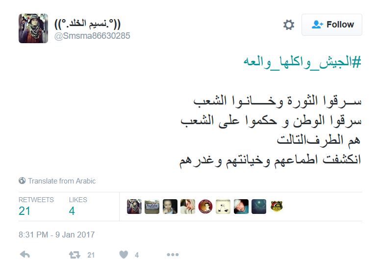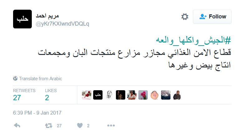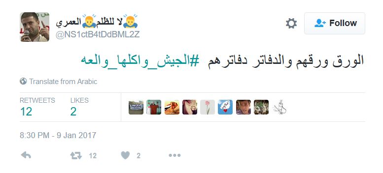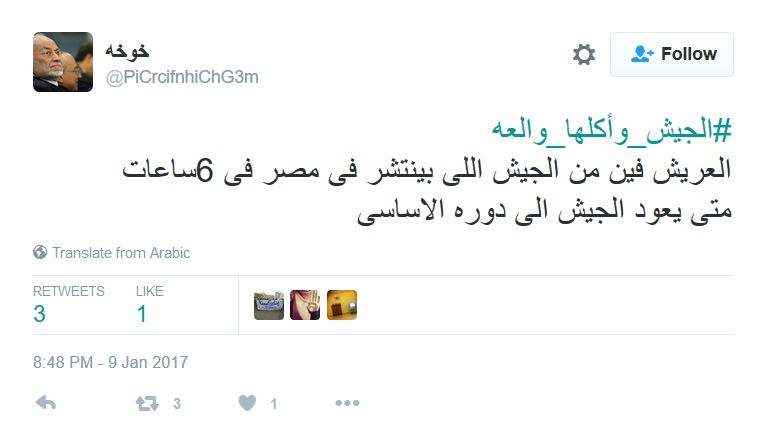 ودشن رود مواقع التواصل هاشتاج “الجيش_واكلها_والعه”، والذي تصدر قائمة الأوسمة الأكثر انتشارً وتفاعلا على موقع “تويتر”.
