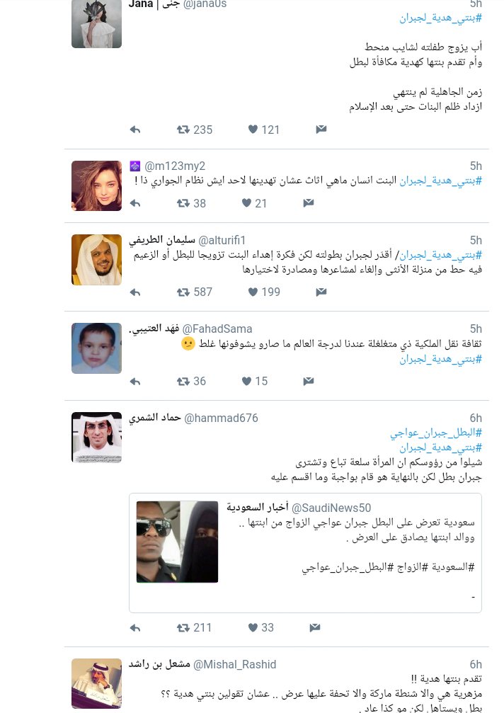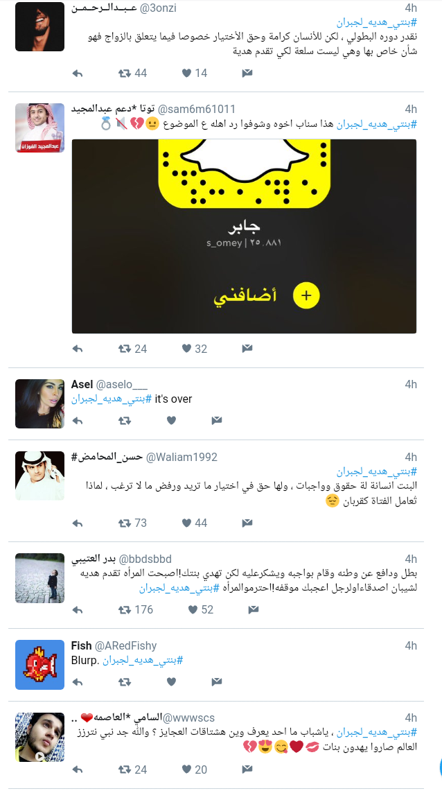 وعبّر كل ناشط عن الهاشتاج بحسب وجهة نظره، حيث قالت سارة آل علي: “أقدِّر بطولة جبران لكن العطايا والهدايا لا تكون بالبشر فنحن لسنا بعصر الجاهلية والجواري وهذا فيه إلغاء لمشاعرها واختيارها”.
