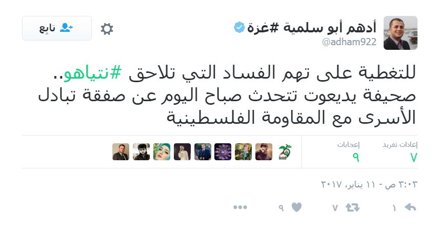 وقال “أبو سلمية” في تغريدة له على موقع “تويتر”: “للتغطية على تهم الفساد التي تلاحق نتياهو.. صحيفة يديعوت تتحدث صباح اليوم عن صفقة تبادل الأسرى مع المقاومة الفلسطينية”.