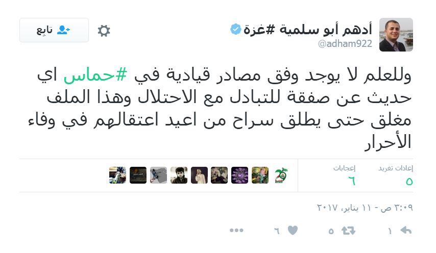 وأضاف: “وللعلم لا يوجد وفق مصادر قيادية في حماس أي حديث عن صفقة للتبادل مع الاحتلال وهذا الملف مغلق حتى يطلق سراح من أعيد اعتقالهم في وفاء الأحرار”.