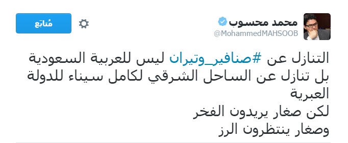 وقال في تغريدة عبر حسابه الرسمي بموقع التدوينات القصيرة “تويتر”: “التنازل عن صنافير وتيران ليس للمملكة العربية لسعودية، بل تنازل عن الساحل الشرقي لكامل سيناء للدولة العبرية”، في الإشارة إلى “إسرائيل”.